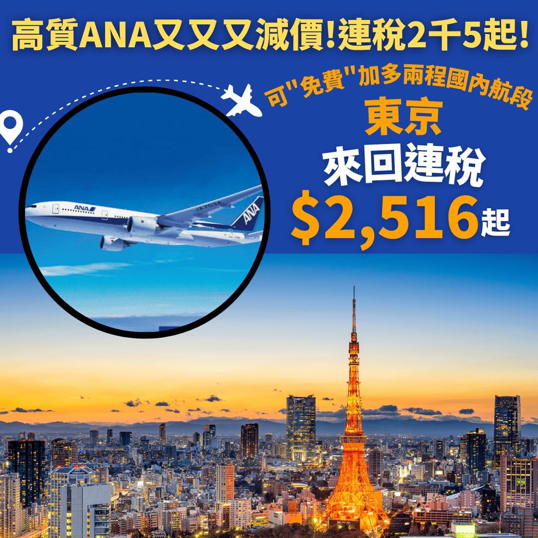 ANA官網:https://www.ana.co.jp/zh/hk/ (來回連稅:東京羽田$2,623起、東京成田$2,634起)