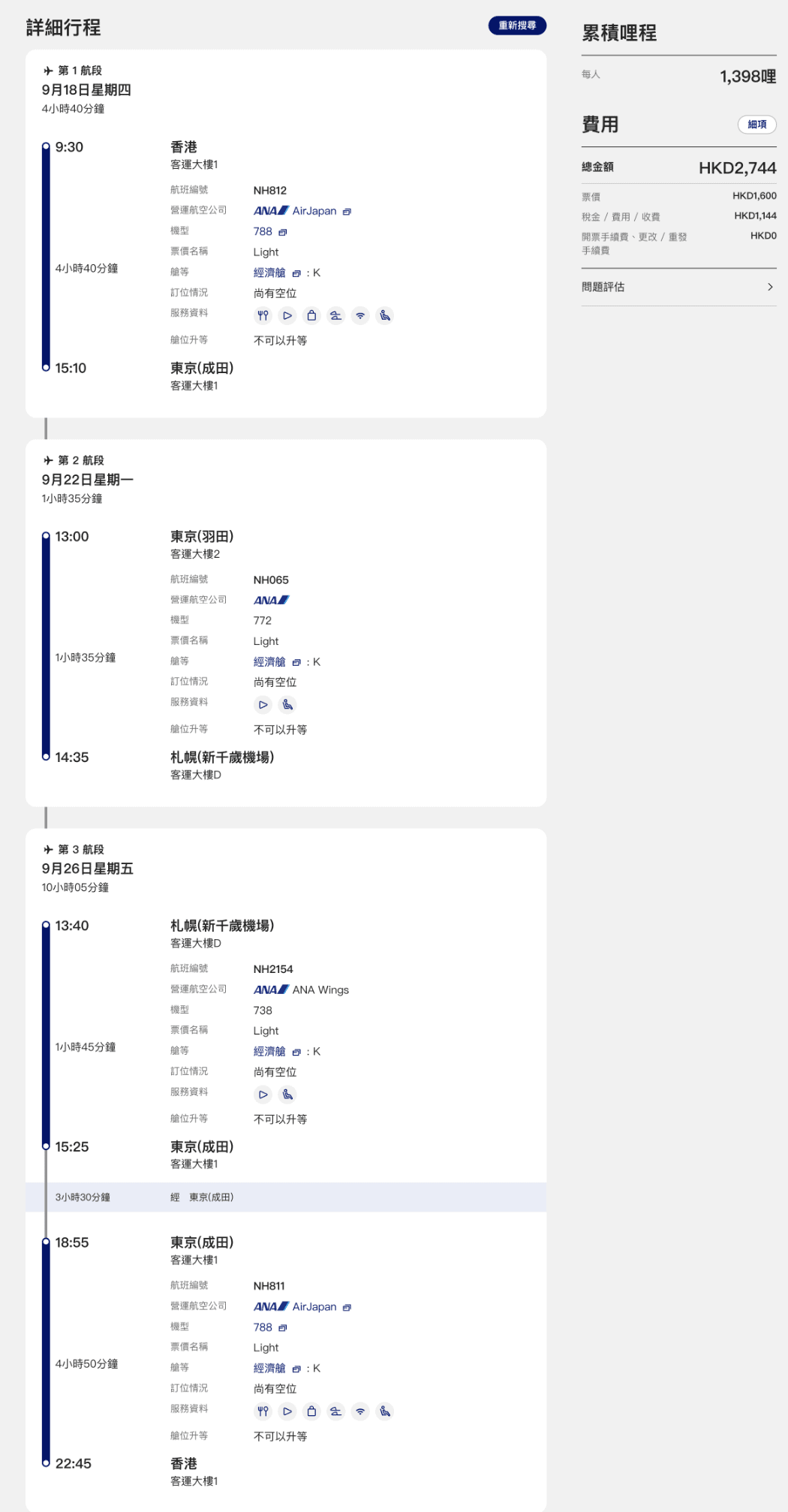 9月18日香港飛東京成田,9月22日東京羽田飛札幌,9月26日札幌經東京成田飛香港來回連稅$2,744起