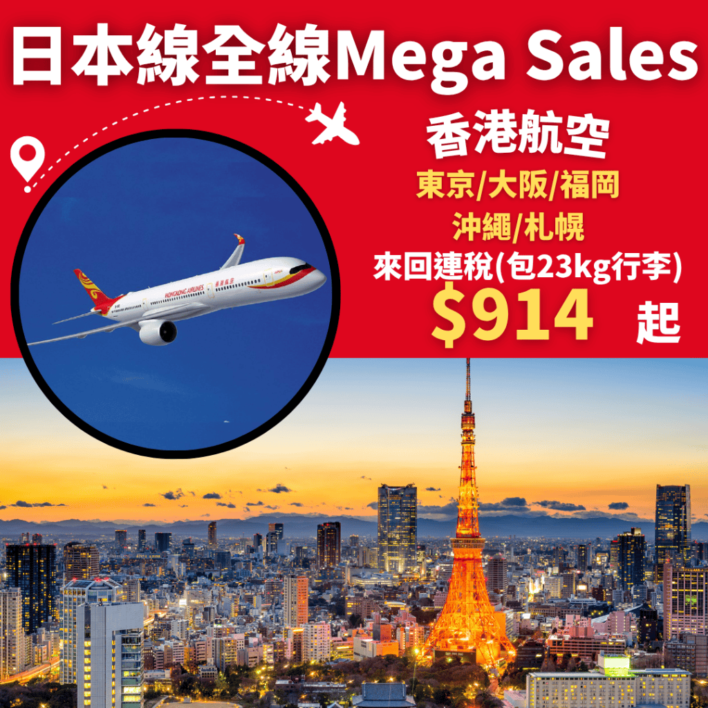 嘩!大癲!平到癲!港航日本線Mega Sales!連稅九百飛沖繩、一千飛福岡、千一飛東京/大阪、千九飛札幌!12月17日前出發!包23kg寄艙行李 – 香港航空 (優惠至7月20日)