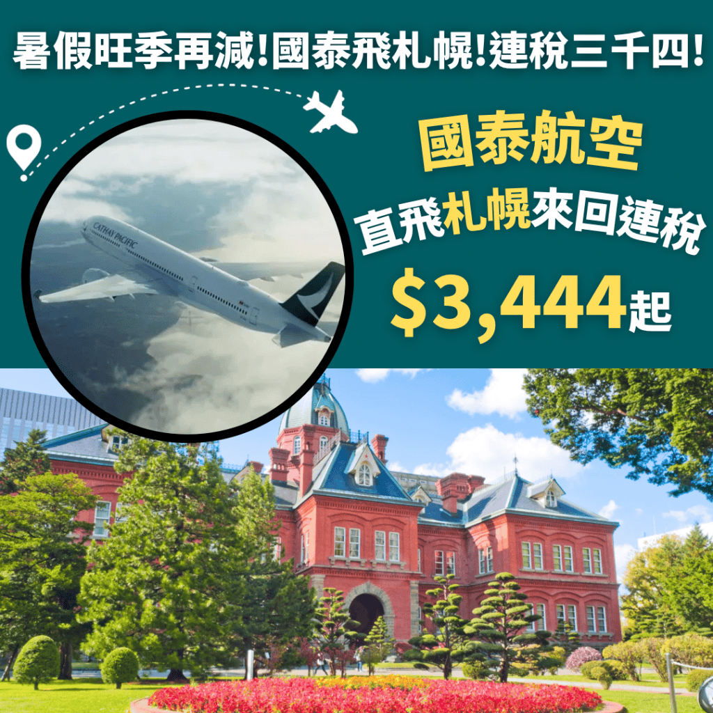 暑假旺季再減!國泰飛札幌!連稅三千四!9月30日前出發!香港飛札幌來回連稅$3,424起 – 國泰航空 (優惠至7月31日)