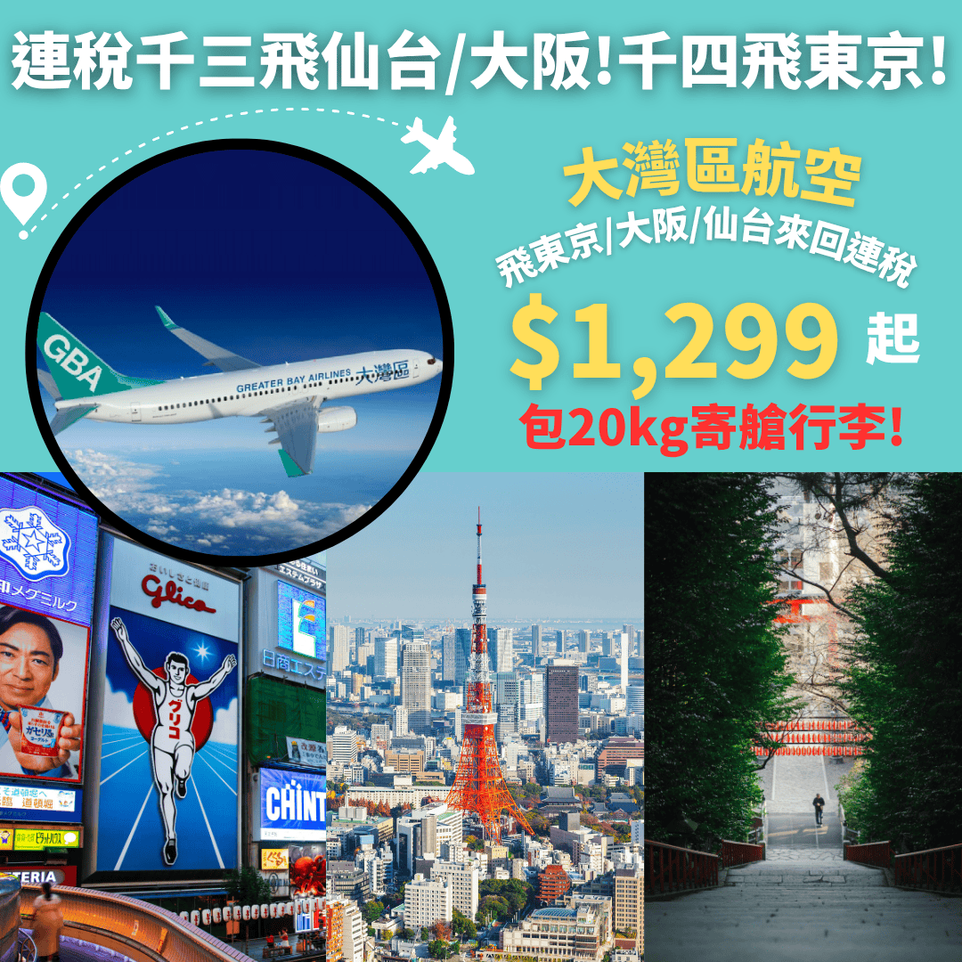 連稅千三飛仙台/大阪!千四飛東京!12月19日前出發!暑假旺季都有平!包20kg寄艙行李!香港飛仙台來回連稅只需$1,299起、大阪$1,391起、東京$1,469起 – 大灣區航空 (優惠至7月6日)