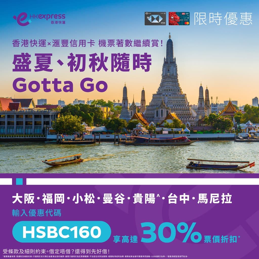 大家只要於HK Express網頁版輸入優惠代碼「HSBC160」並以滙豐信用卡付款可享低至7折優惠