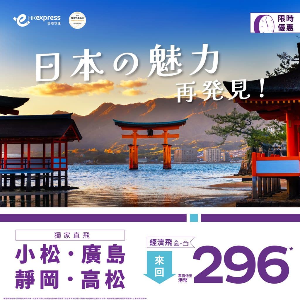 香港飛廣島、靜岡、高松、小松單程只需$98起