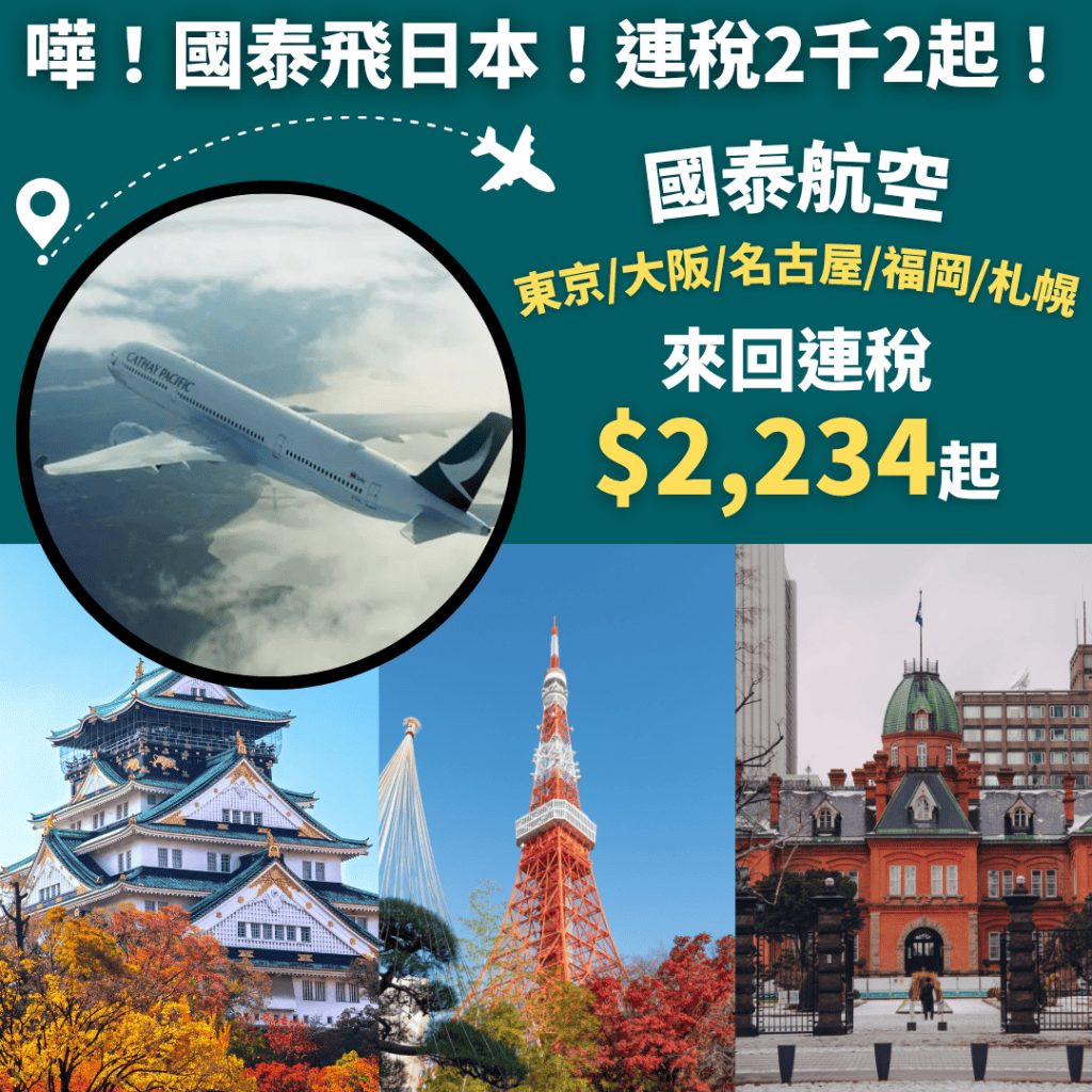 嘩!國泰飛日本減到12月出發啦!連稅2千2起!12月11日前出發!香港飛東京/大阪/福岡/名古屋/札幌來回連稅每人只需$2,234起 – 國泰航空 (優惠至7月31日)