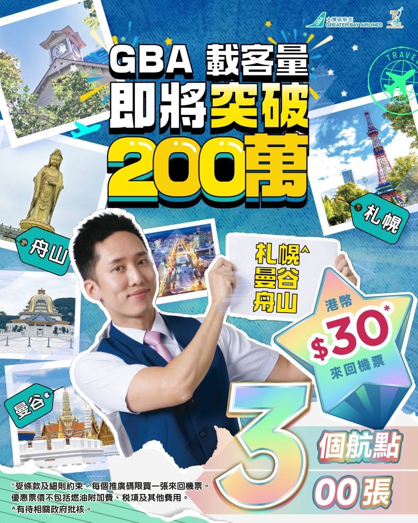 大灣區航空為慶祝載客量即將突破二百萬,推出限時12小時優惠