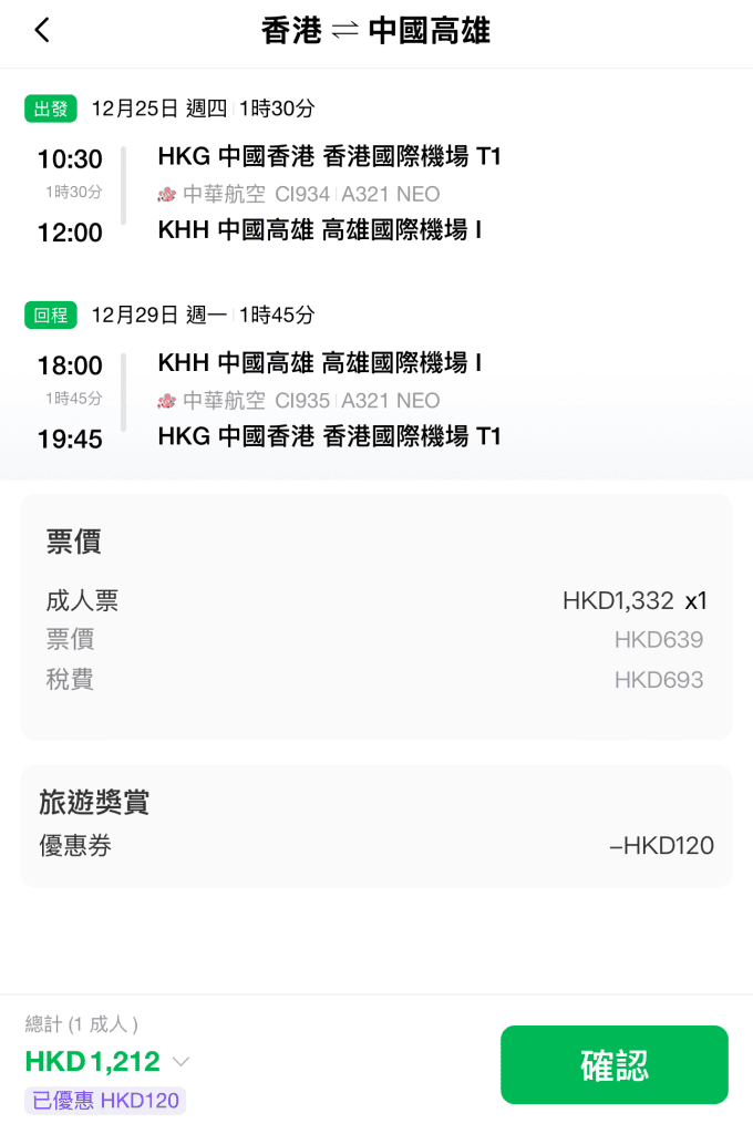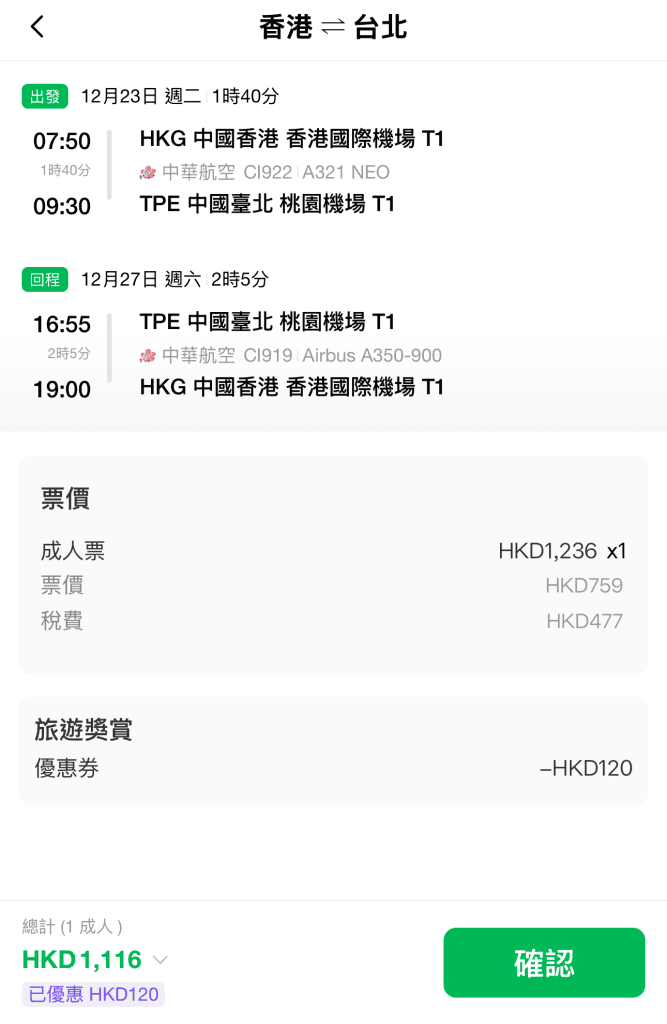 減$120後,來回連稅:台北$1,116起、高雄$1,131起