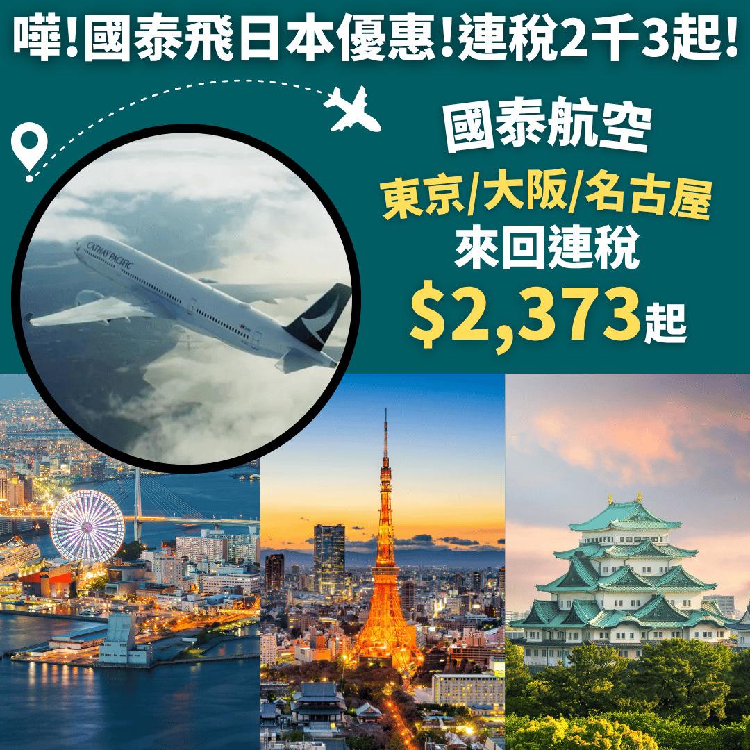 國泰飛日本優惠!連稅2千1起!12月11日前出發!香港飛東京/大阪/名古屋來回連稅每人只需$2,178起 – 國泰航空 (優惠至8月31日)