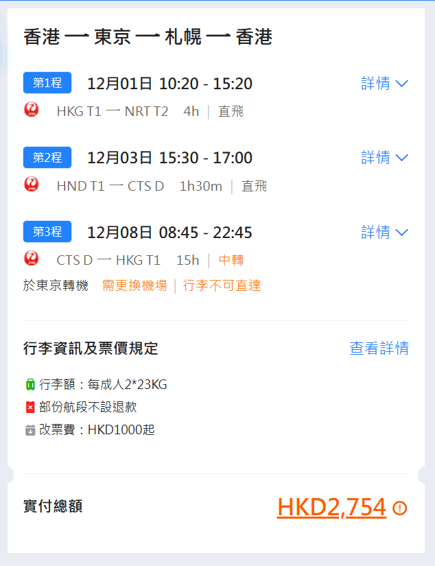 以12月1日香港飛東京成田,12月3日東京羽田飛札幌,12月8日札幌飛東京羽田,再由東京成田飛香港來回連稅$2,754