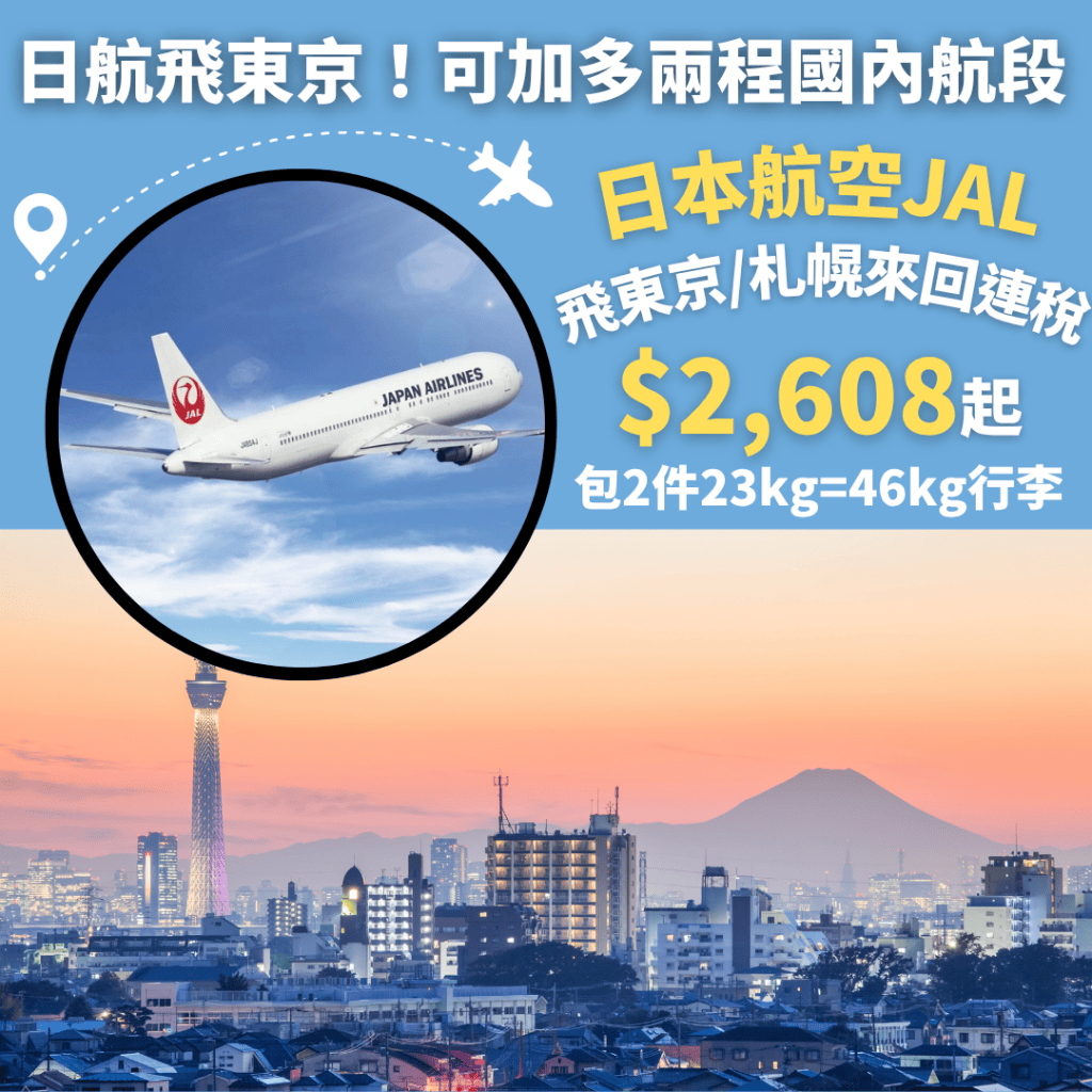 高質日航JAL飛東京!連稅2千5!可”免費”加多兩程國內航段!明年3月31日前出發!包2件x23kg寄艙行李!香港飛東京成田來回連稅只需$2,499起、札幌$2,667起 – 日本航空 (優惠至8月15日)