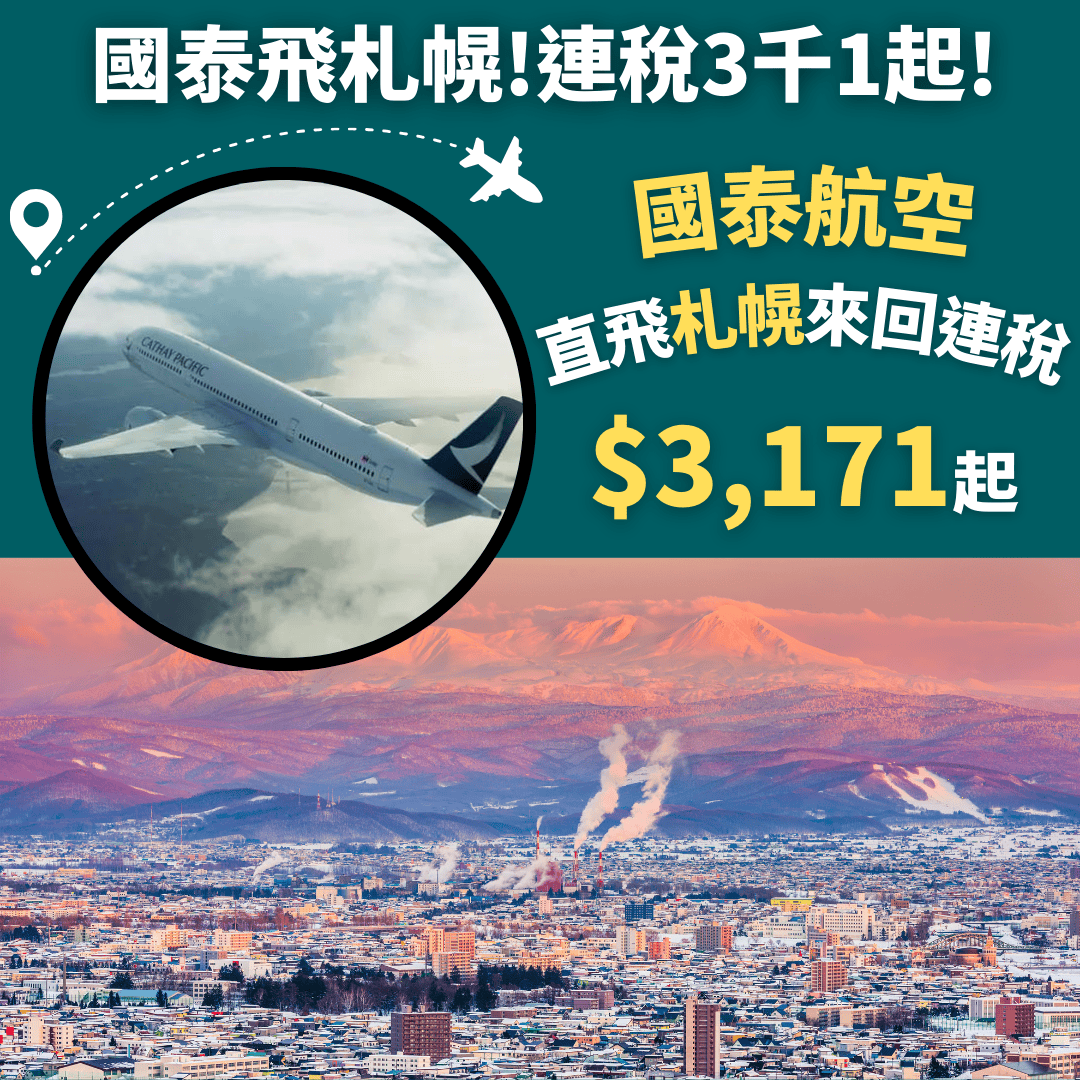 嘩!國泰飛札幌又再減啦!連稅3千1起!12月11日前出發!香港飛札幌來回連稅只需$3,171起 – 國泰航空 (優惠至8月31日)