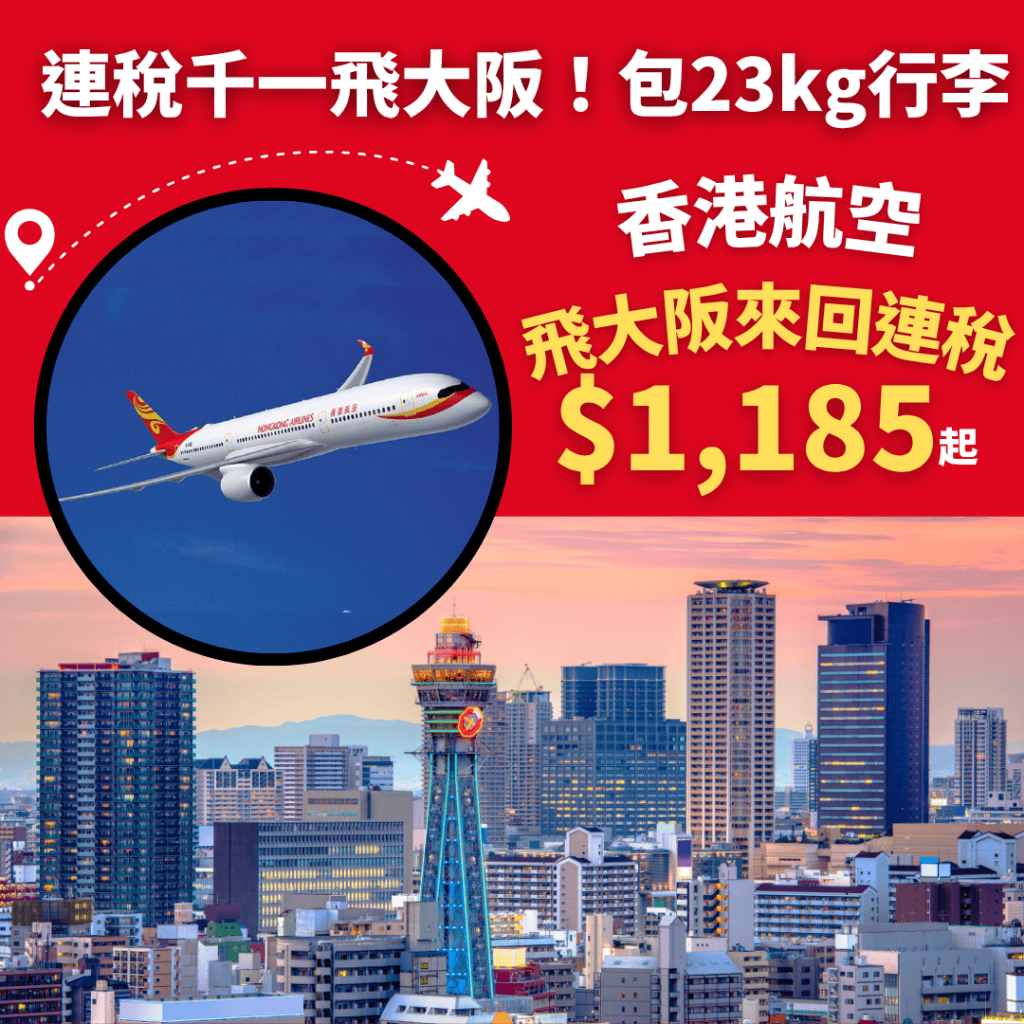 連稅千一飛大阪!包23kg寄艙行李!10月25日前出發!香港飛大阪來回連稅只需$1,185起 – 香港航空 (優惠至10月25日)