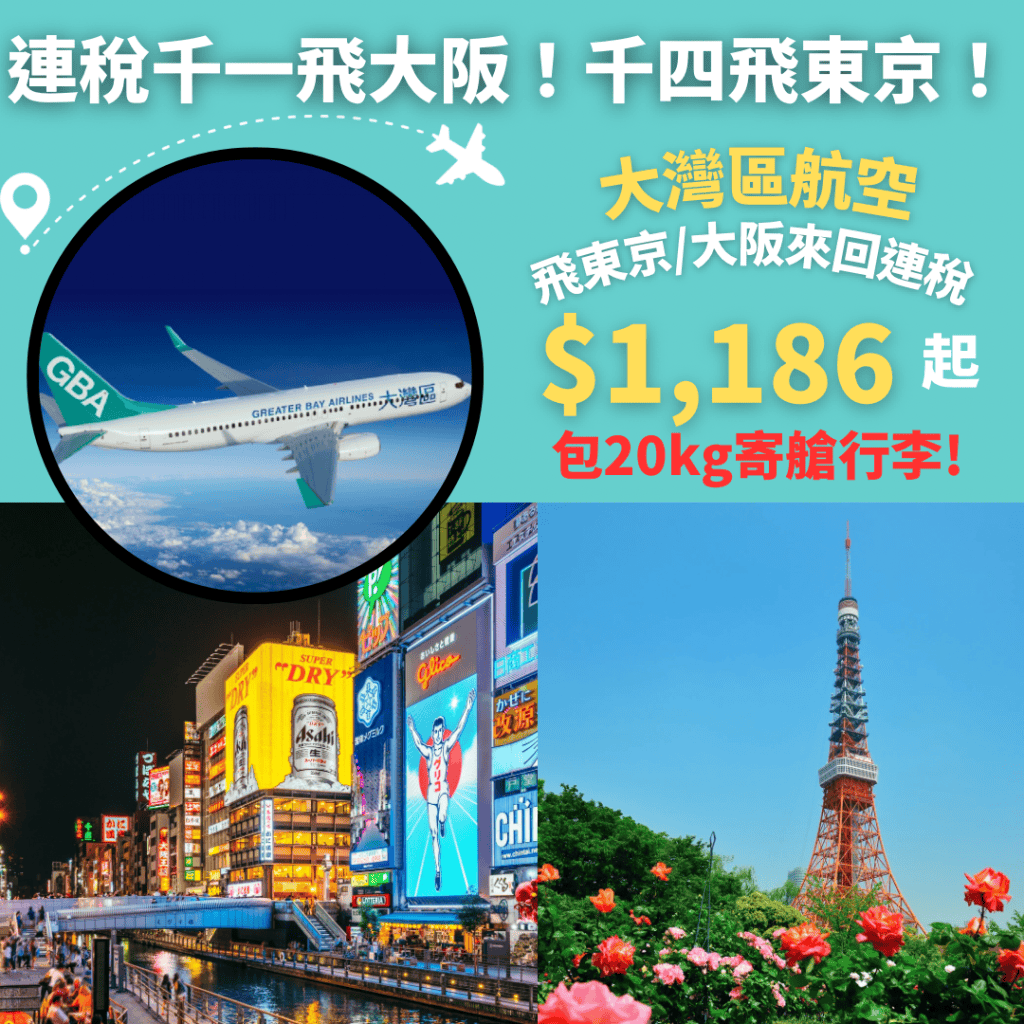 抵呀!連稅千三飛大阪!千四飛東京!9月25日前出發!包20kg寄艙行李!香港飛大阪來回連稅只需$1,327起、東京$1,479起 – 大灣區航空 (優惠至8月31日)