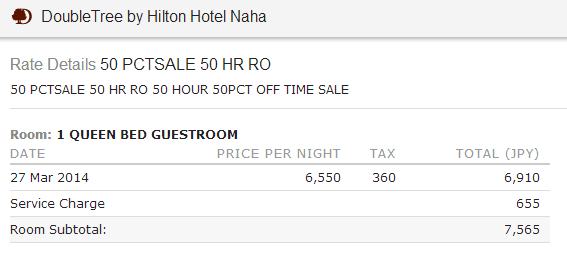 我們以3月27日入住,3月28日退房,沖繩 DoubleTree by Hilton Hotel Naha 每晚連稅7,565円