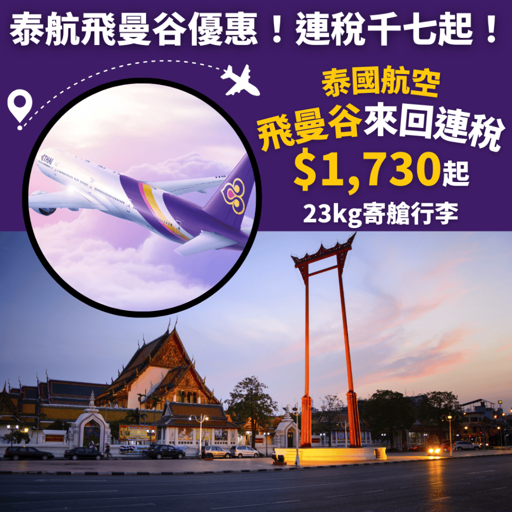 香港飛曼谷來回連稅只需$1,730起,價錢同國泰差唔多