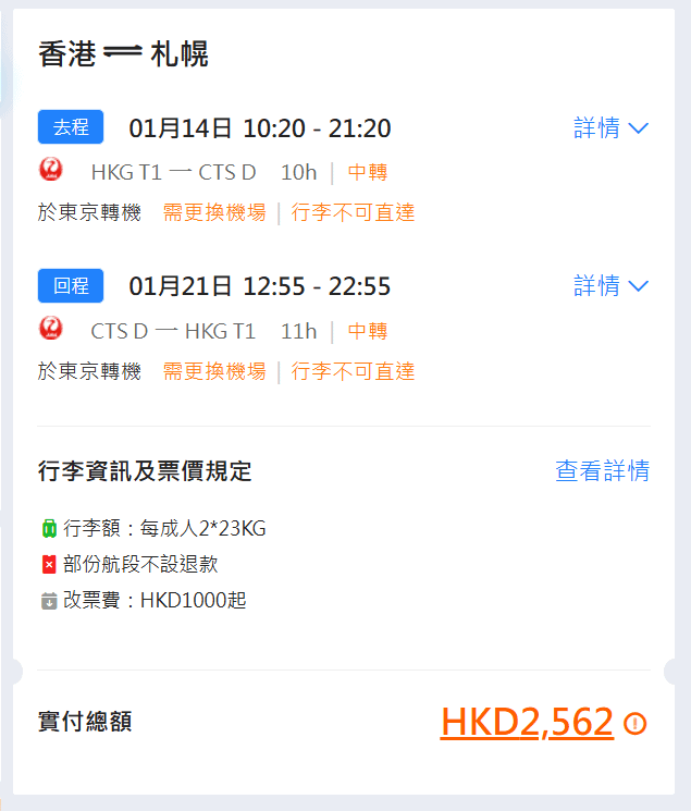 以1月14日出發,1月21日返回為列,香港經東京飛札幌來回連稅$2,562 (留意大部份日子去程都需要成田往羽田轉機,而回程需要羽田往成田轉機)