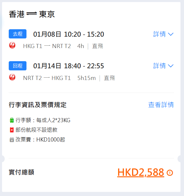 以1月8日出發,1月14日返回為列,香港飛東京成田來回連稅$2,588