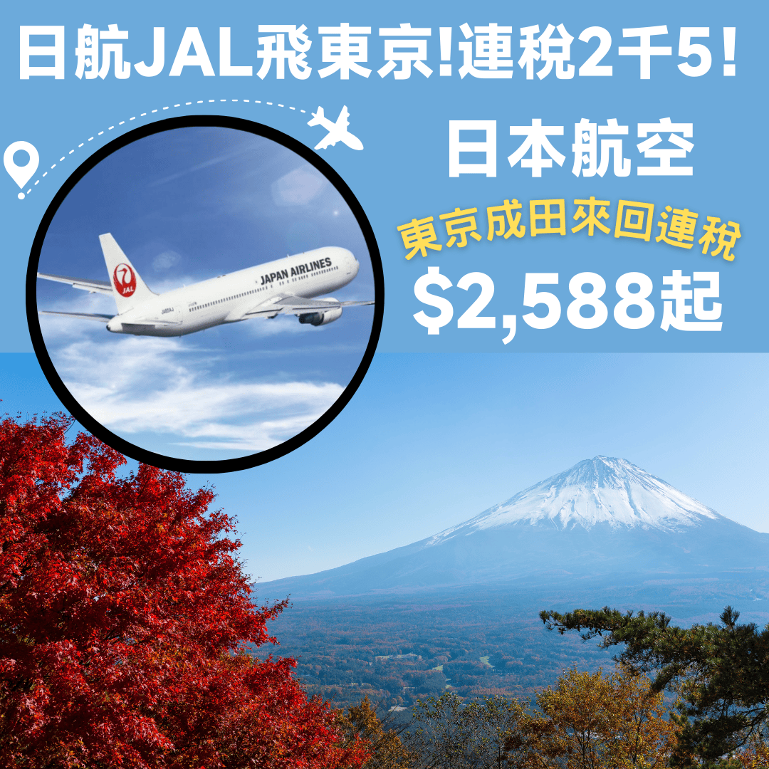 日航JAL飛東京又減啦!連稅2千5!可”免費”加多兩程國內航段!明年4月30日前出發!包2件x23kg寄艙行李!香港飛東京成田來回連稅只需$2,588起、札幌$2,562起 – 日本航空 (優惠至9月19日)