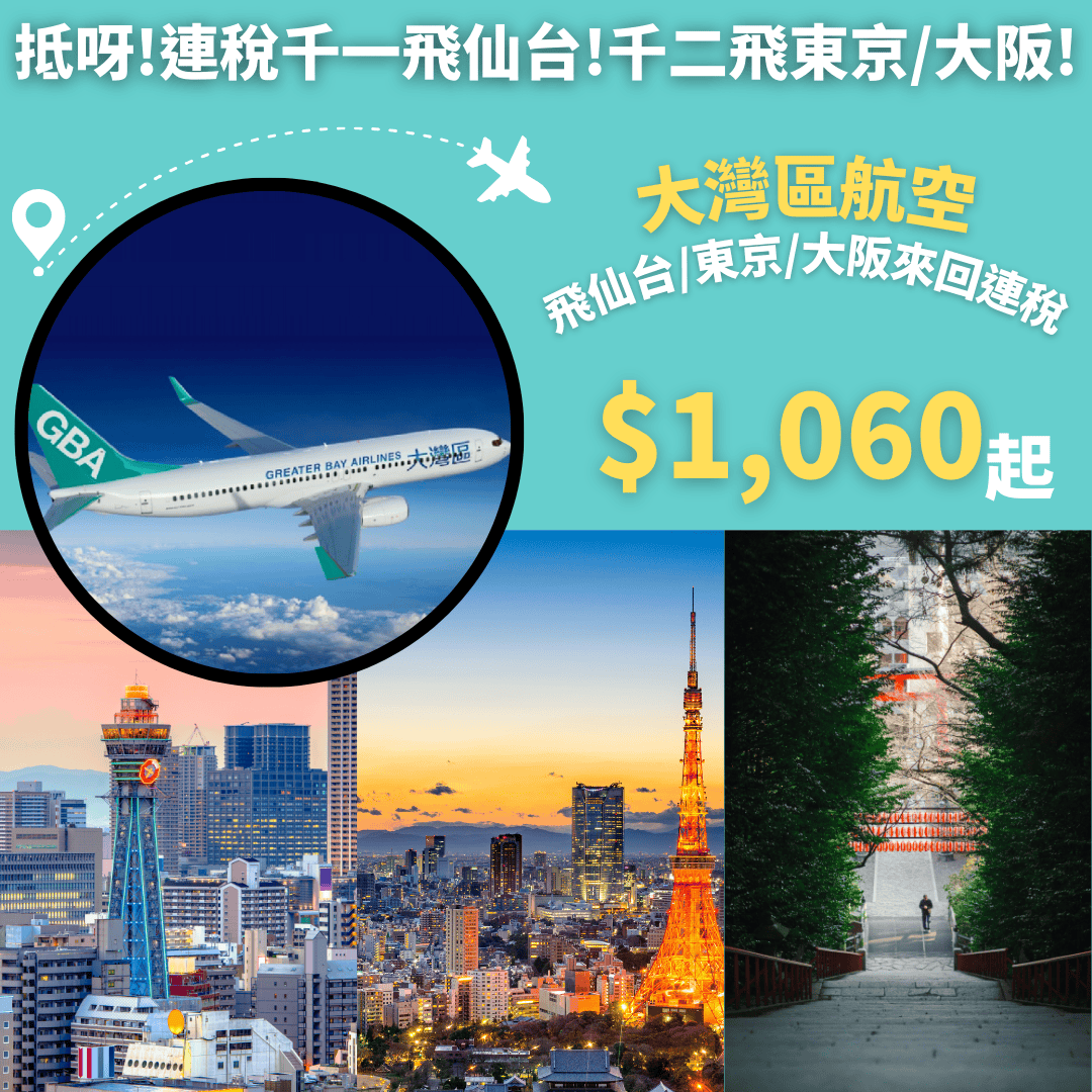 抵呀!連稅千一飛仙台!千二飛東京/大阪!11月30日前出發!包20kg寄艙行李!香港飛仙台來回連稅只需$1,172起、大阪$1,264起、東京$1,270起 – 大灣區航空 (優惠至9月14日)