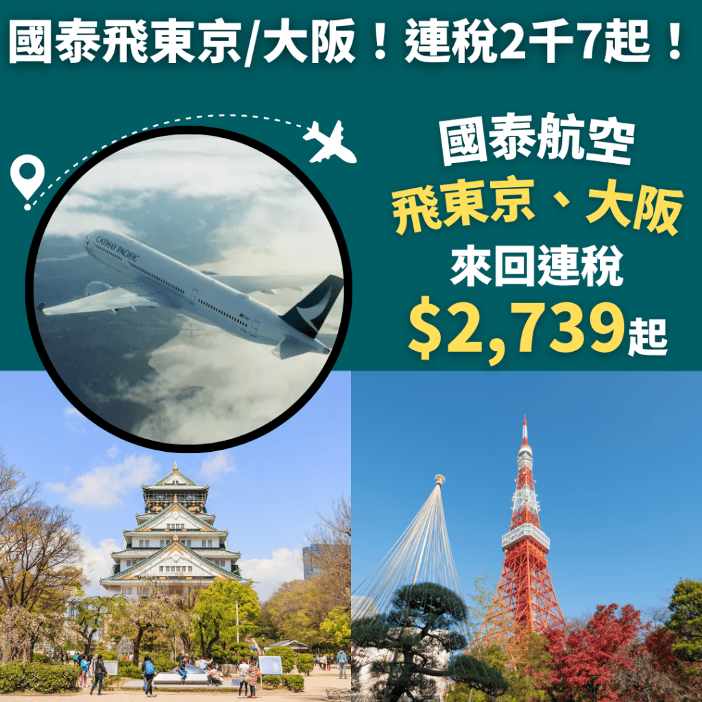 國泰飛東京/大阪!連稅2千7起!12月11日前出發!香港飛東京、大阪來回連稅只需$2,738起 – 國泰航空 (優惠至10月31日)