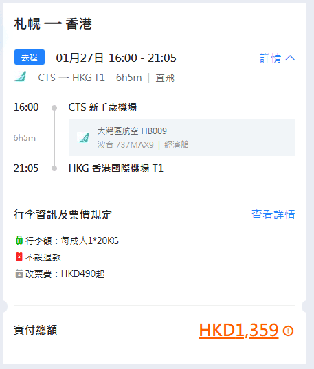 札幌飛香港單程連稅千三!明年3月28日前回程!包20kg寄艙行李!札幌飛香港來回連稅只需$1,359起 – 大灣區航空