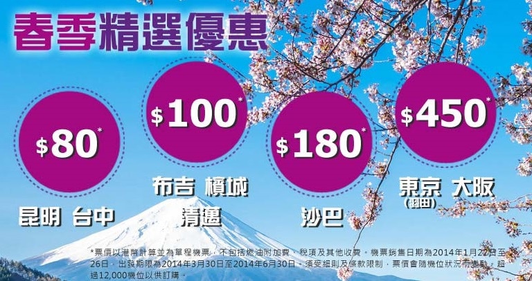 香港飛昆明台中單程只需$100,布吉清邁檳城$100,東京大阪$450