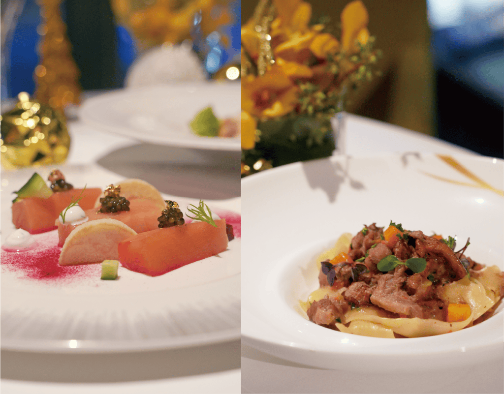 餐單:(左) 醃三文魚、(右)托斯卡納式鴨肉寬帶麵
