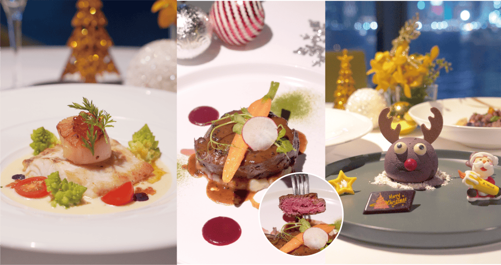 餐單(主食二選一):(左)板燒鱸魚拼香煎北海道帶子 或 (中)烤和牛牛柳!食埋聖誕小鹿甜品,氣氛滿滿!