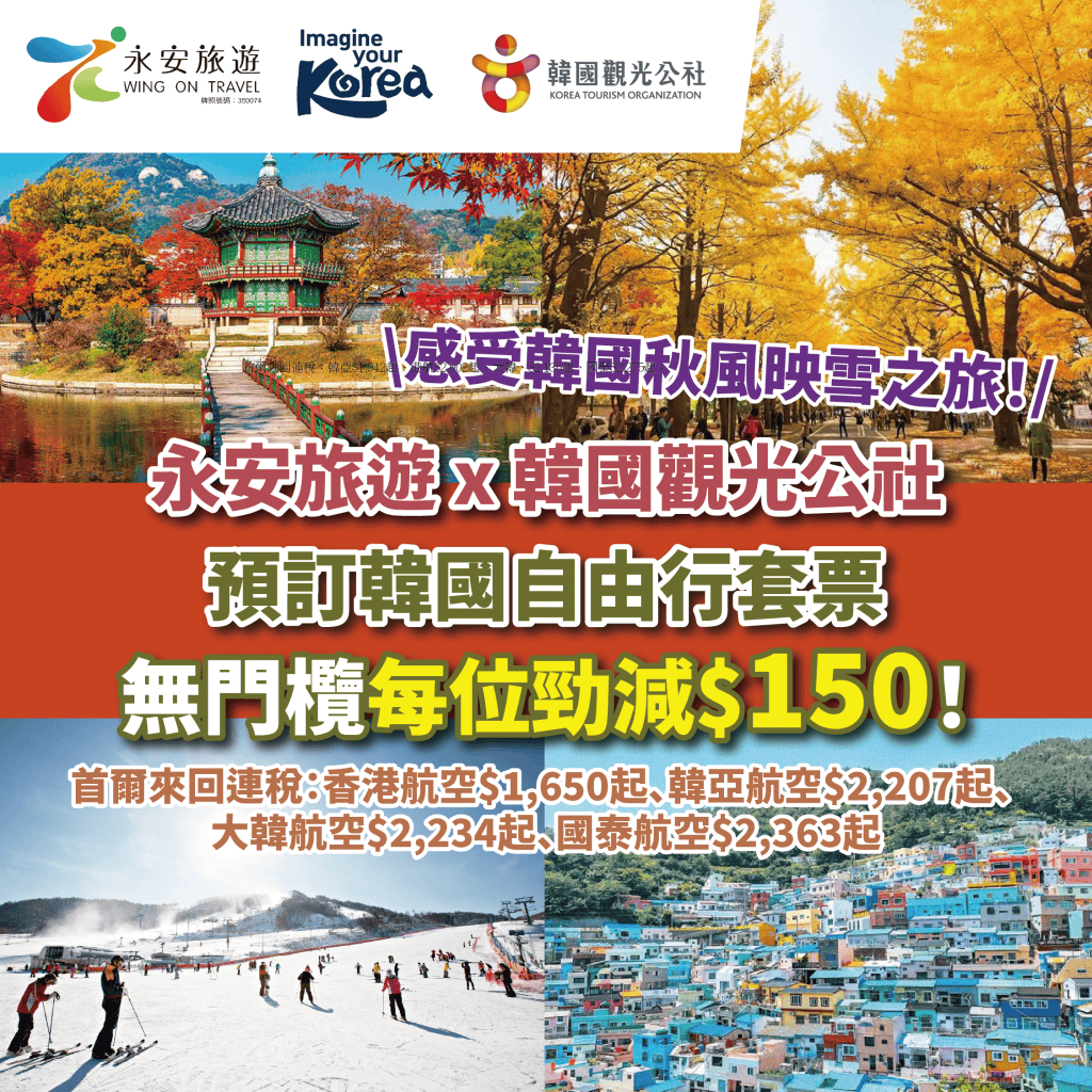 【永安旅遊 x 韓國觀光公社】感受韓國秋風映雪之旅!首爾來回連稅:香港航空$1,650起、韓亞航空$2,207起、 大韓航空$2,234起、國泰航空$2,363起!預訂韓國(機票+酒店)自由行套票,無門欖每位勁減HK$150!