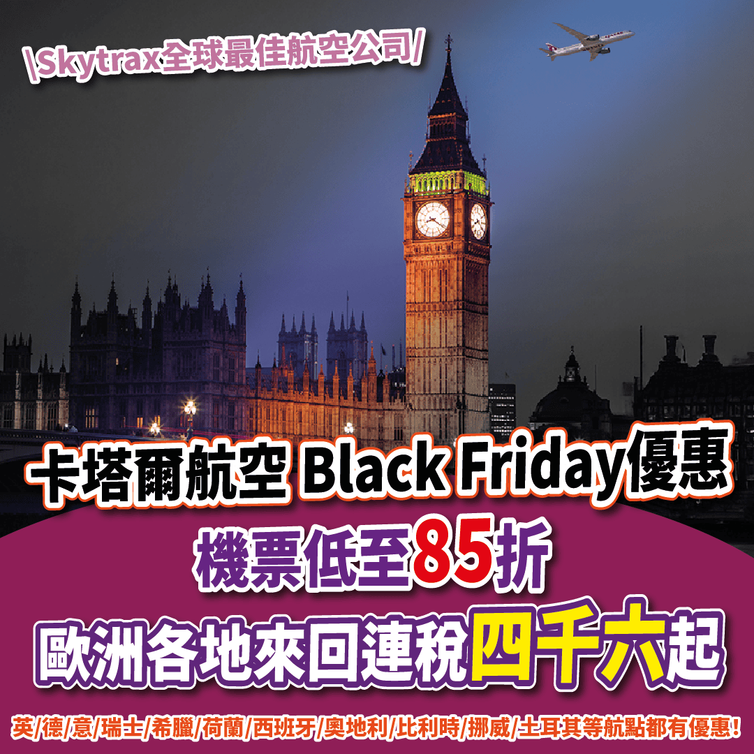 【卡塔爾航空Black Friday優惠,機票低至85折】飛歐洲來回連稅四千六起!英/德/意/瑞士/希臘/荷蘭/西班牙/奧地利/比利時/挪威/土耳其等航點都有優惠!仲可以open jaw,一次過玩多幾個城市!出發日期可遠至明年6月!