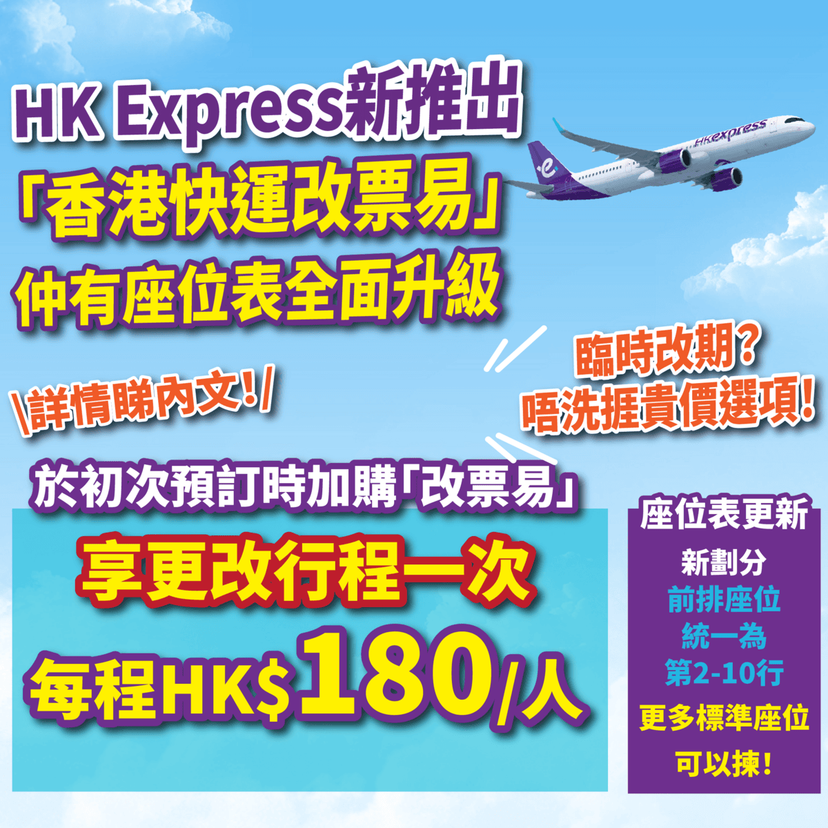 HK Express新推出「香港快運改票易」!慳足$400!改期更抵玩只需$180,可享改機票一次!仲有座位表全面升級:前排座位統一為第2-10行,落機更加快捷!