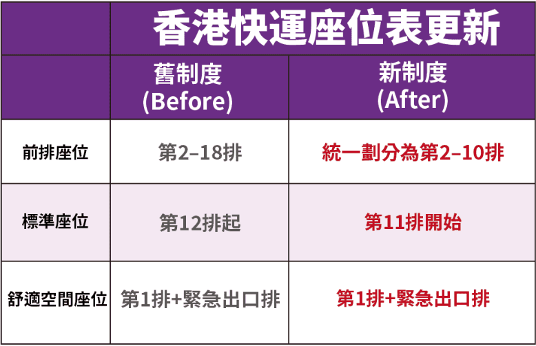【香港快運座位表全面升級】標準座位/前排座位/舒適空間座位全新劃分!揀位更清晰、更易揀!