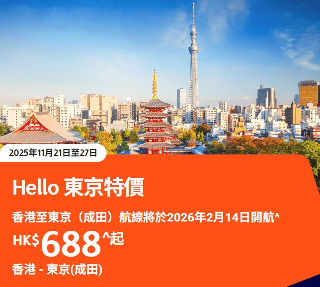 抵呀!連稅千一飛東京!凌晨機去晚機返!明年6月25日前出發!香港飛東京成田來回連稅只需$1,178起 – Jetstar Japan (優惠至11月27日)