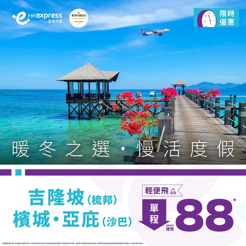 香港飛檳城/亞庇(沙巴)/吉隆坡(梳邦)單程只需$88起,來回連稅$947起