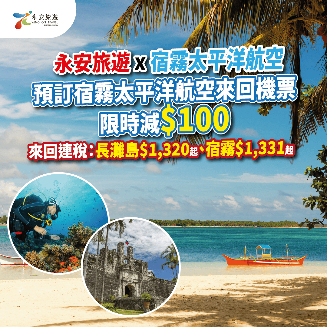 【永安旅遊 x 宿霧太平洋航空】預訂來回機票每單減$100!