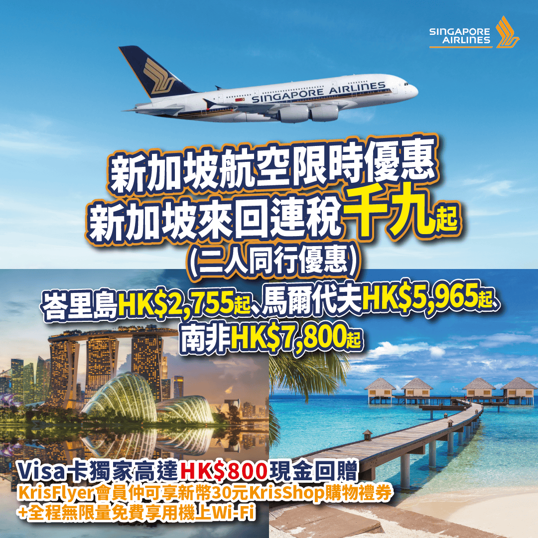 飛新加坡連稅千九起!新加坡航空限時優惠!來回連稅:新加坡HK$1,997起、峇里島HK$2,755起、馬爾代夫HK$5,965起!Visa卡獨家高達HK$800現金回贈!KrisFlyer會員仲可享新幣30元KrisShop購物禮券+全程無限量免費享用機上Wi-Fi!