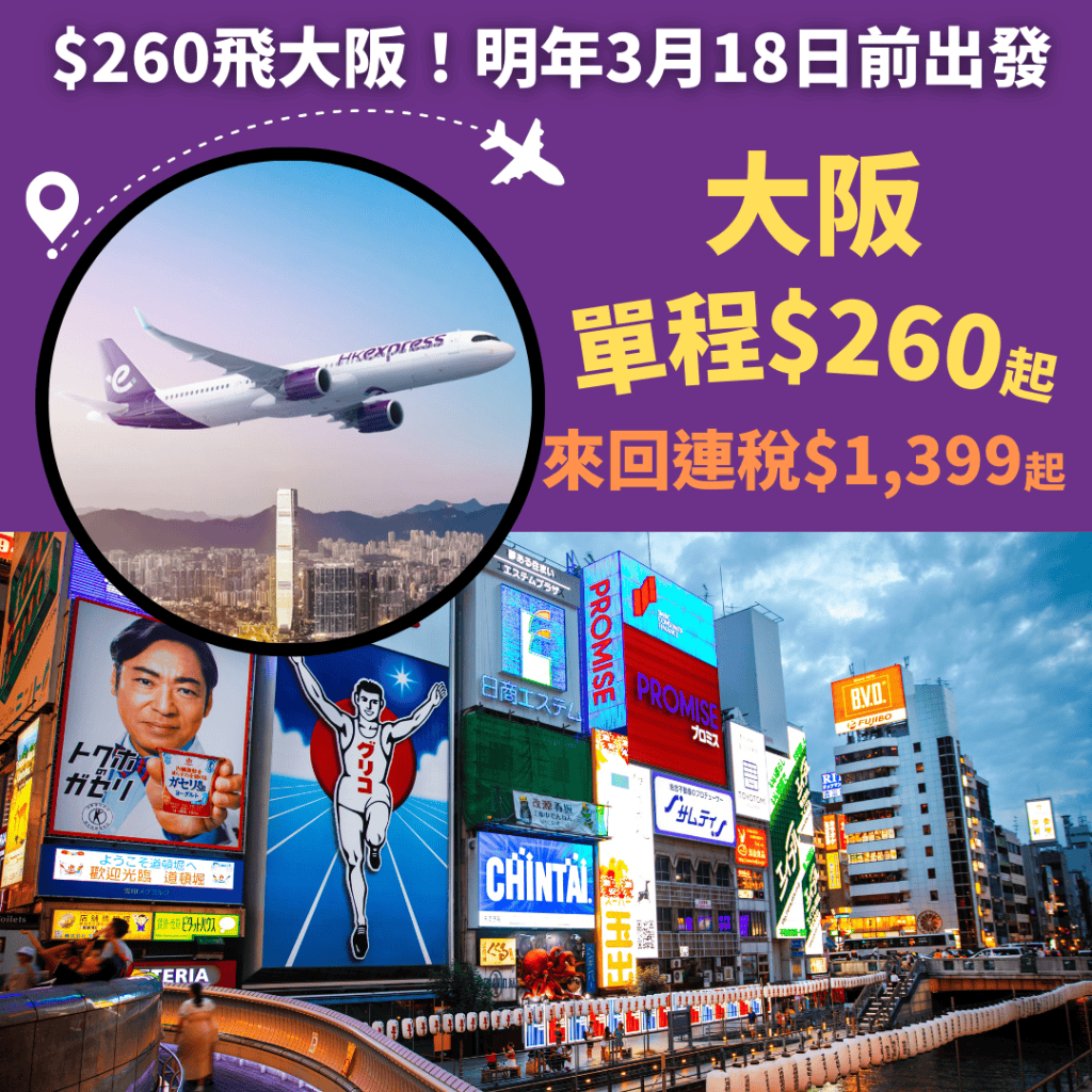 香港飛大阪單程只需$260起,來回連稅$1,399起