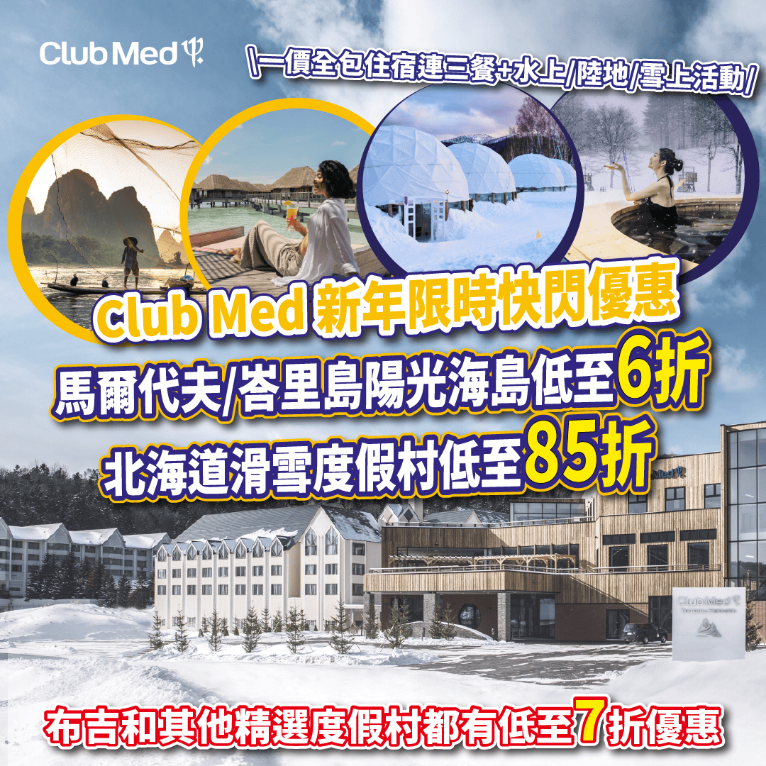 【Club Med新年限時快閃優惠】新年新旅程!馬爾代夫/峇里島/布吉陽光海島度假村低至6折!北海道滑雪度假村低至85折!一價全包住宿連三餐+水上/陸地/雪上活動!