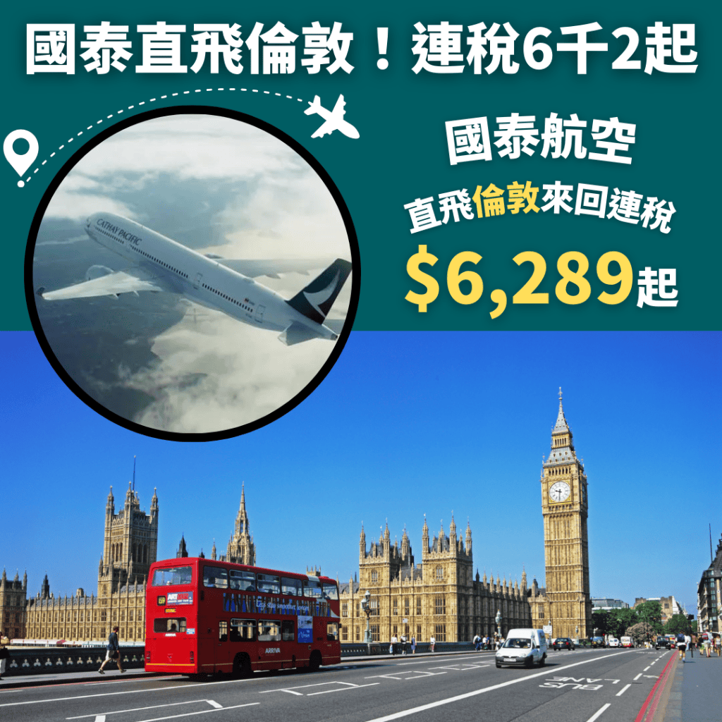 國泰直飛倫敦!連稅6千2!明年6月30日前出發!香港直飛倫敦來回連稅只需$6,289起 – 國泰航空 (優惠至12月29日)