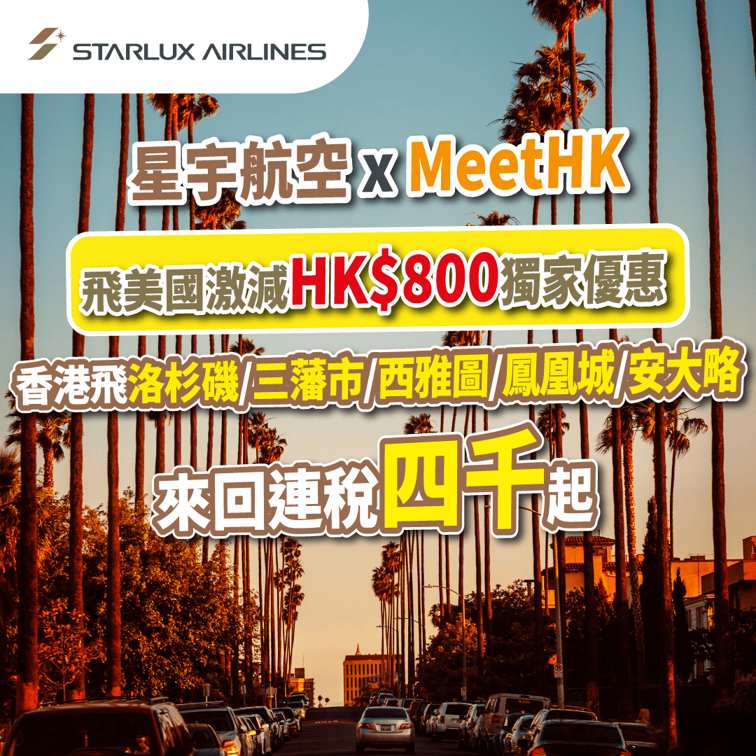 喺星宇航空官網預訂香港飛美國洛杉磯、三藩市、西雅圖、鳳凰城、安大略單程/來回機票,輸入MeetHK獨家優惠碼【JXFD800】每位即減$800!