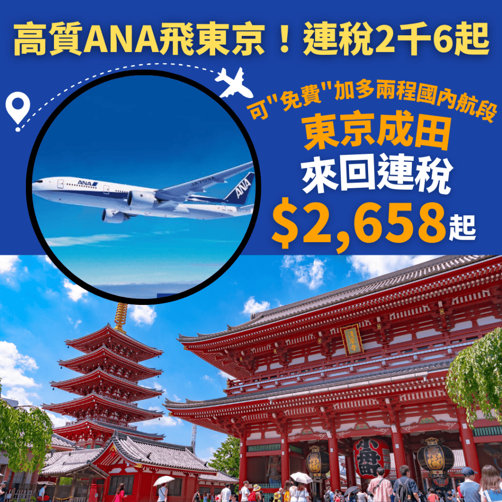 ANA官網:https://www.ana.co.jp/zh/hk/ (來回連稅$2,896起)