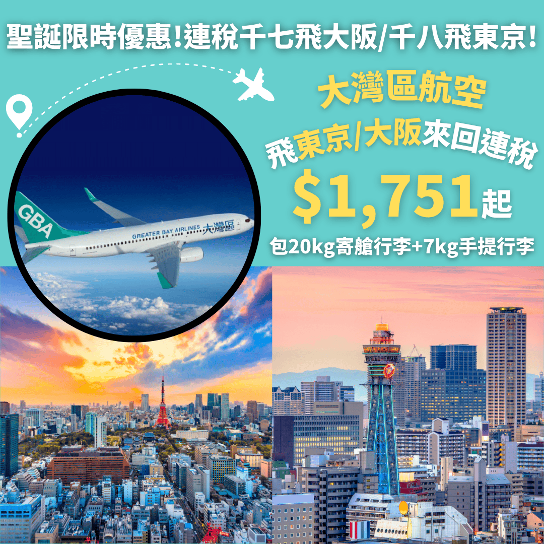 聖誕限時優惠!連稅千七飛大阪、千八飛東京!包20kg寄艙行李!明年2月5日前出發!香港飛大阪來回連稅$1,751起、東京$1,807起 – 大灣區航空 (優惠至12月26日)
