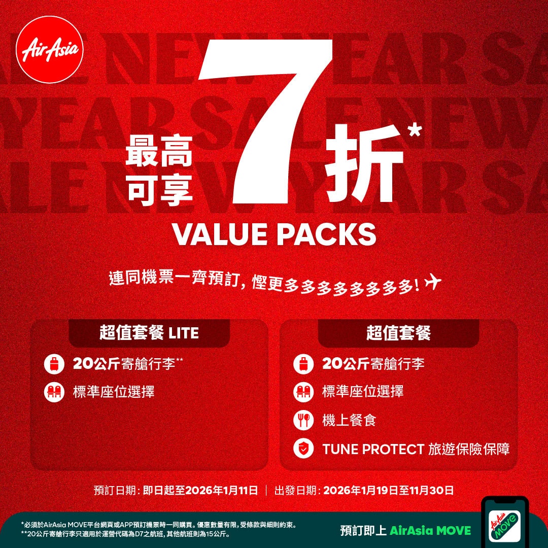 AirAsia包咗免費7kg手提行李,短途快閃夠晒用!如果打算Shopping或買手信返屋企!建議訂飛時記得一併加購「Value Pack 超值套裝」,同樣享有高達7折優惠!套裝包埋20kg寄艙行李、飛機餐、揀位同Tune Protect旅遊保險保障,旅行更安心!(詳情:https://www.airasia.com/aa/inflight-comforts/zh/hk/value-pack.html) 如果飛馬來西亞、泰國、菲律賓境內航班(例如:吉隆坡✈️檳城、曼谷✈️布吉等),可以根據行李需求加購「Value Pack 超值套裝」或者「Value Pack LITE 超值套裝 LITE」,同樣有折!超值套裝 LITE包15kg寄艙行李+揀位,仲會平啲!