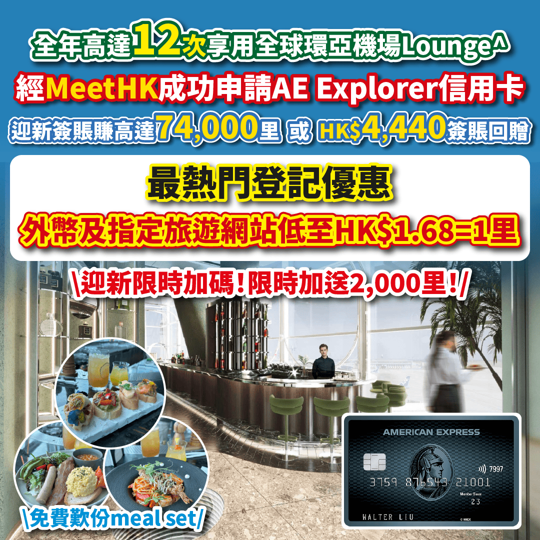 【AE Explorer信用卡1月迎新限時加送2,000里!】儲里數必備信用卡!經MeetHK成功申請可享成功申請可享迎新獎賞賺高達74,000里 或 HK$4,440簽賬回贈!全年高達12次入lounge^![必登記優惠]外幣及指定旅遊網站低至HK$1.68=1里!