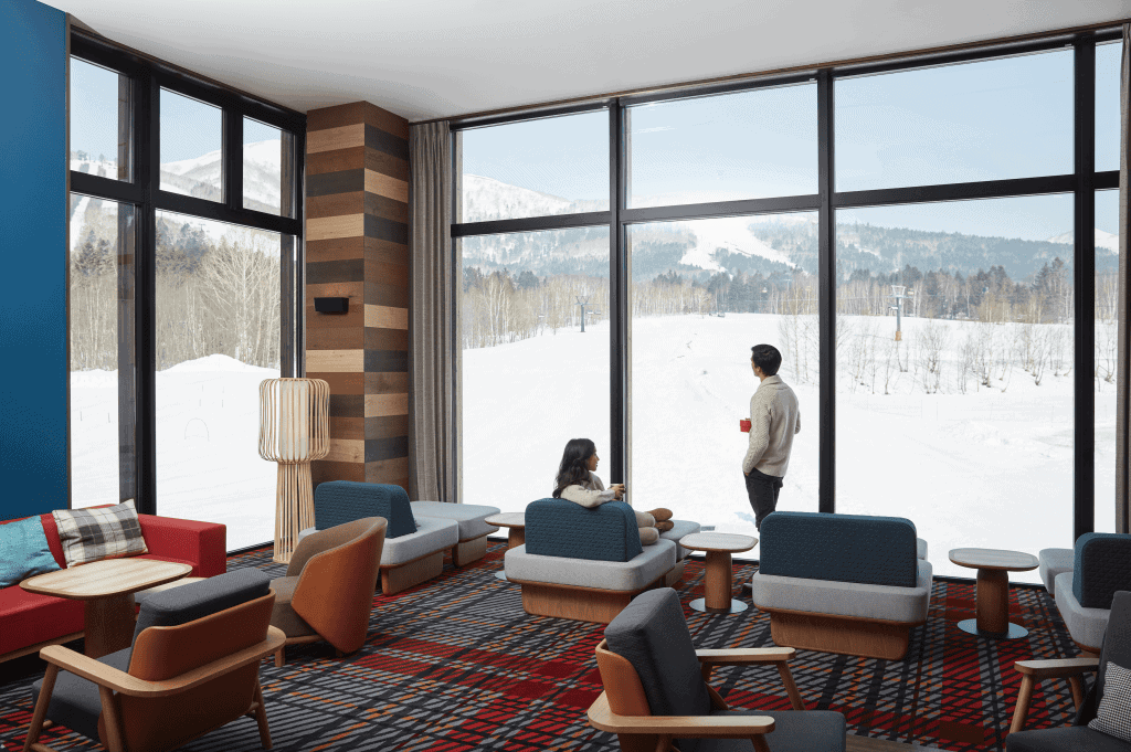 由法國設計師 Jean Philippe Nuel 主理,融合摩登與日式風格,房間最小400呎起,窗外山間雪景一望無際,坐擁無邊山景!