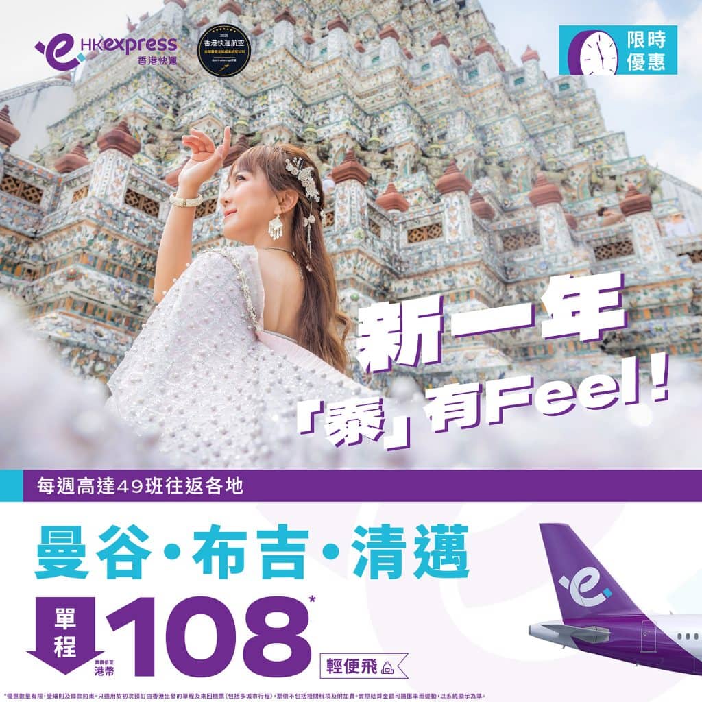 泰國限時優惠!7月8日前出發!香港飛曼谷/布吉/清邁單程只需$108起 – HK Express (優惠至1月6日)