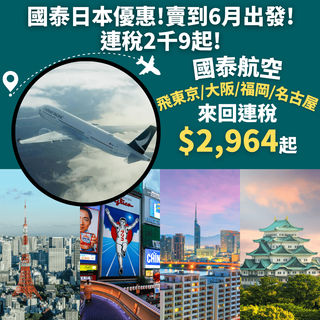 國泰日本優惠!賣到6月出發啦!連稅2千9起!6月30日前出發!香港飛東京/大阪/福岡/名古屋連稅$2,946起 – 國泰航空 (優惠至1月31日)