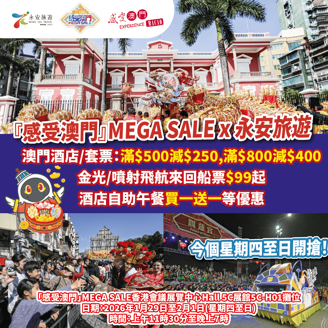 『感受澳門』MEGA SALE x 永安旅遊 今個星期四至日(1月29日至2月1日)會喺會展《香港旅遊博覽會2026》推出會場限定優惠!