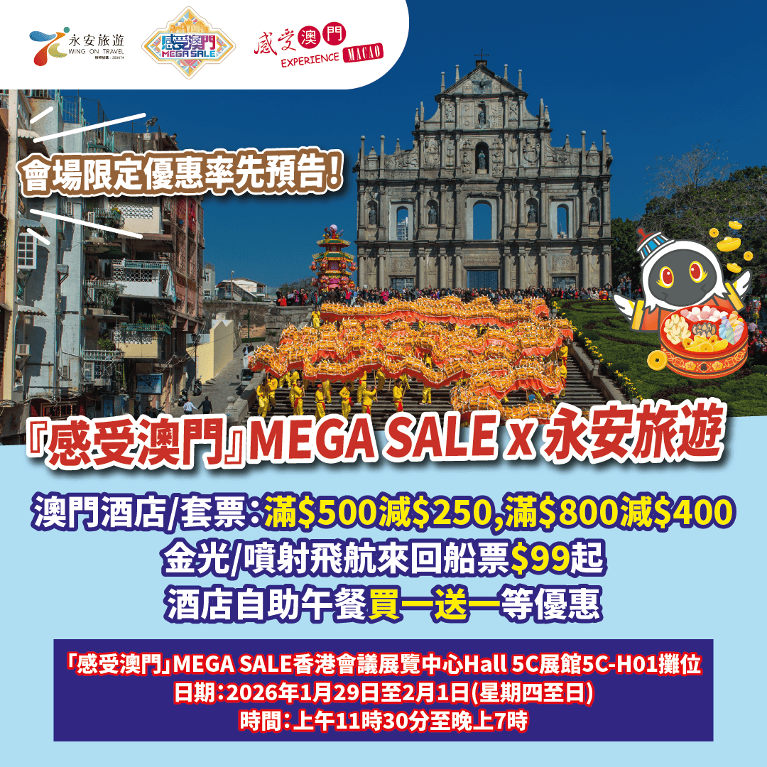 感受澳門MEGA SALE x 永安旅遊 將於1月29日至2月1日(星期四至日)喺會展《香港旅遊博覽會》推出會場限定優惠!