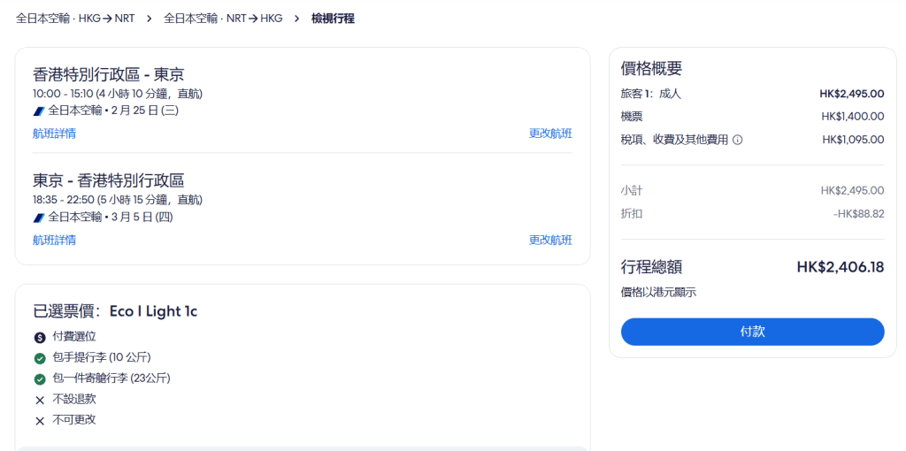 以2月25日出發,3月5日返回為列,香港飛東京成田來回連稅$2,406