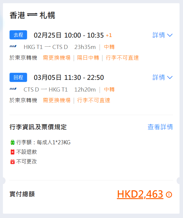 以2月25日香港經東京成田,2月26日東京羽田飛札幌,3月5日札幌飛東京羽田,再由東京成田飛香港,來回連稅$2,463